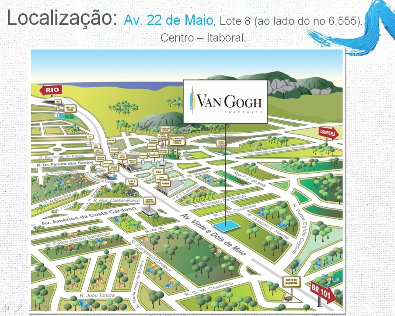 O Van Gogh Corporate tem localização privilegiada na Av. 22 de Maio, a principal da cidade. O empreendimento é próximo a tudo o que você precisa, como bancos, supermercados, lojas e farmácias, além do COMPERJ - Complexo Petroquímico do Rio de Janeiro. Porque queremos oferecer mais facilidade ao seu dia a dia.
